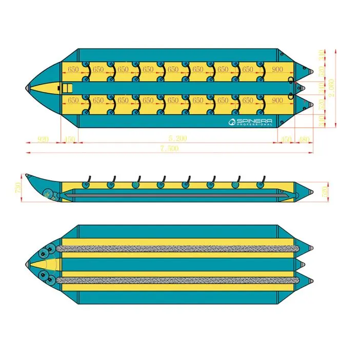 Notre double Multirider a été conçu en pensant aux exploitants de stations commerciales. Cette conception du Double Multirider tire plus facilement avec moins de résistance à l’eau en raison de la montée progressive de la proue et de la poupe. De grands anneaux de manille renforcés sont situés sur les deux tubes.